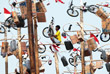 Участник соревнования Панжат Пинанг добрался до призов, висящих на вершине смазанного жиром столба, во время празднования Дня независимости в Джакарте |