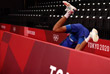 Игрок сборной Франции по волейболу Бартелеми Чинениезе падает за борт во время матча против команды Польши |