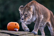 Львица осматривает тыкву в зоопарке в Уэст Колдер, Шотландия |