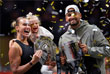 Белорусская теннисистка Арина Соболенко потерпела поражение от австралийца Ника Кирьоса в финальном матче выставочного турнира "Битва полов" в Дубае. На фото: спортсмены на церемонии награждения.