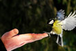 Прохожий кормит синицу в сквере в Новосибирске